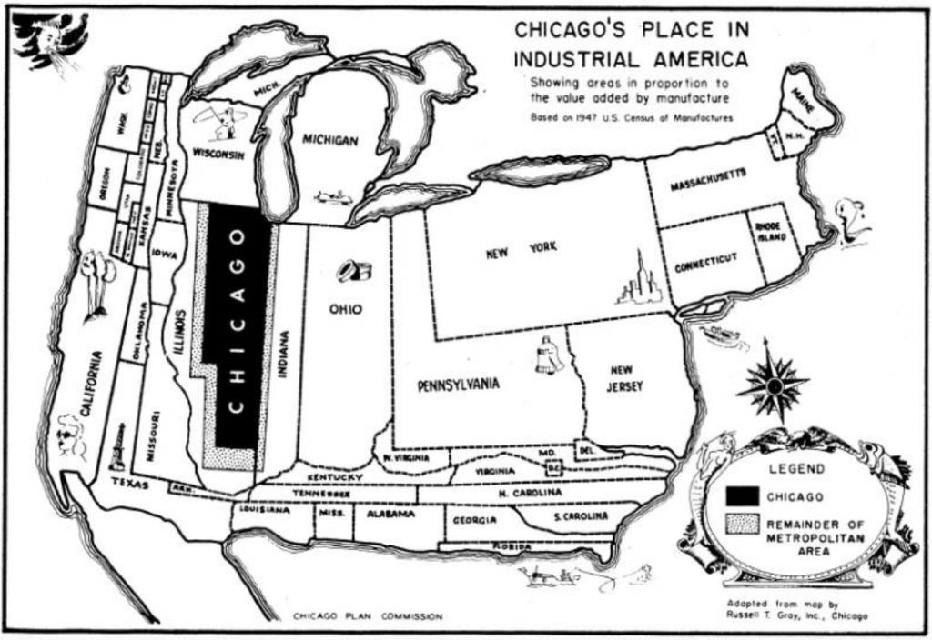 Image credit: Illinois wasn’t always a basket case. Decades ago, before Illinois politicians of both parties directly contributed to its decline, the state was an economic powerhouse. Here is just one illustration: “Chicago’s Place In Industrial America,” 1952 “This cartogram captures Chicago’s industrial dominance in the United States even as factories started moving to the suburbs and the sunbelt and the city’s traditionally important industries like railroads and farm equipment began to decline.” Creator: Chicago Plan Commission / Source: Chicago Historical Society (ICHi-37022)
