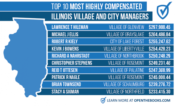 Whenever we open the books, Illinois is consistently one of the worst offenders. Recently, we found auto pound supervisors in Chicago making $144,453; nurses at state corrections earning up to $254,781; junior college presidents making $465,420; university doctors earning $1.6 million; and 84 small-town “managers” out-earning every U.S. governor.