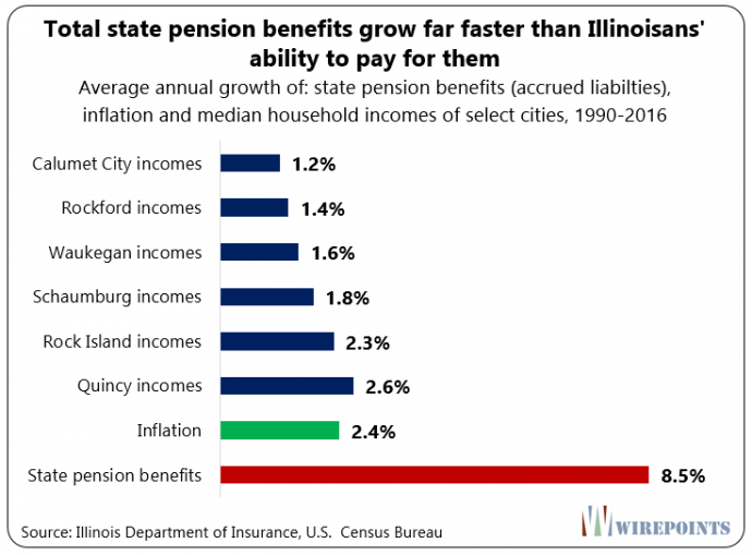 Wirepoints found that total pension benefits owed by the state – to teachers, state workers, university employees, judges and lawmakers – have grown at an 8.5 percent annual clip since 1990. That’s seven times faster than household incomes in Calumet City (1.2 percent annually), six times faster than Rockford’s (1.4 percent) and five times faster than Waukegan’s (1.6 percent).