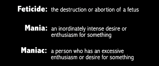 A maniac is “a person who has an excessive enthusiasm or desire for something.” Cassidy has a clearly demonstrated and arguably excessive enthusiasm and desire to promote the legal right of women to exterminate their unborn children (i.e., feticide) without restriction.